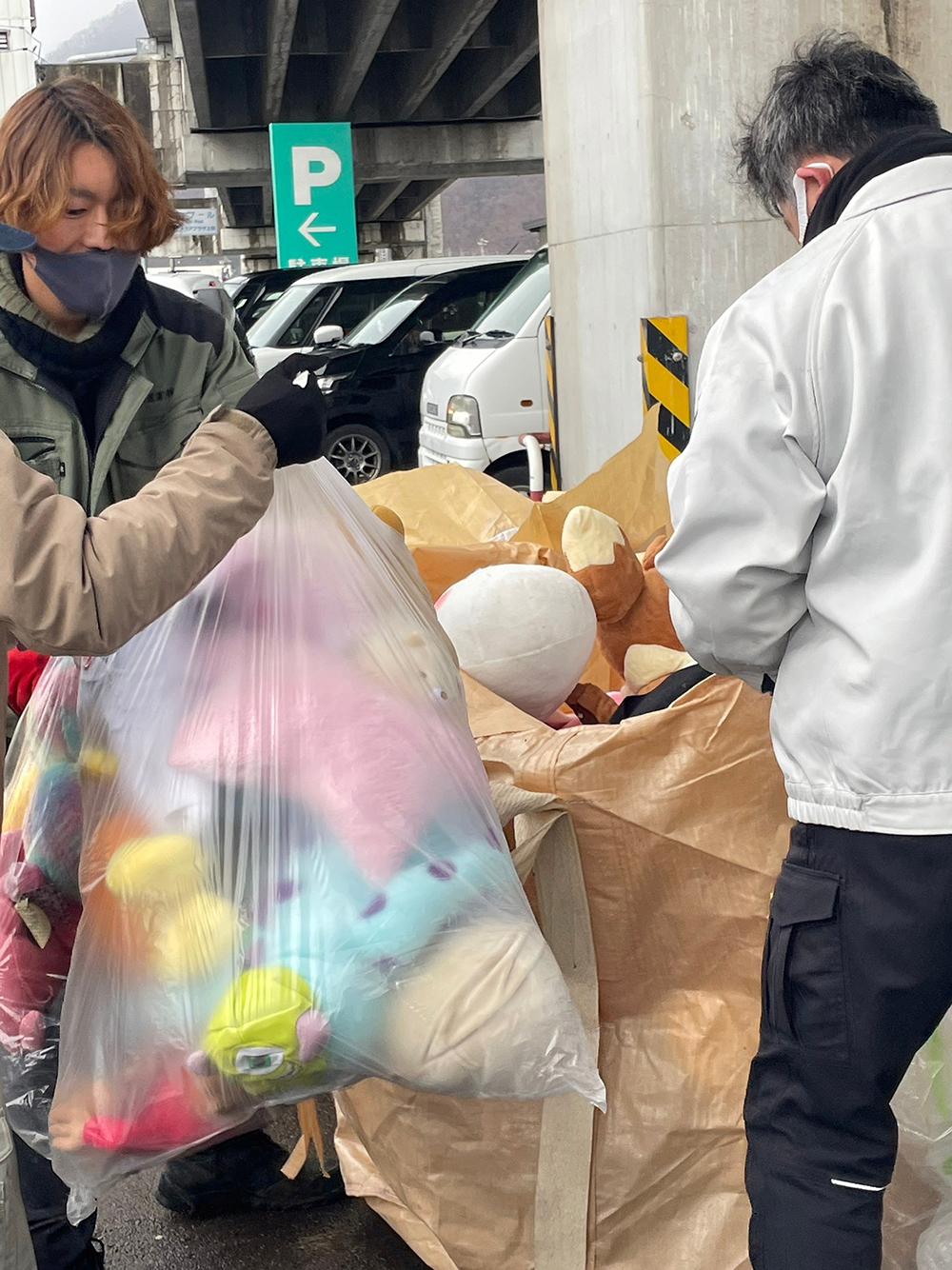 となりでは市役所とカインズが主催となりまして、こども服以外の古着やおもちゃ、不用品などの回収ブースが設置されました。写真の通り、ぬいぐるみもたくさん!