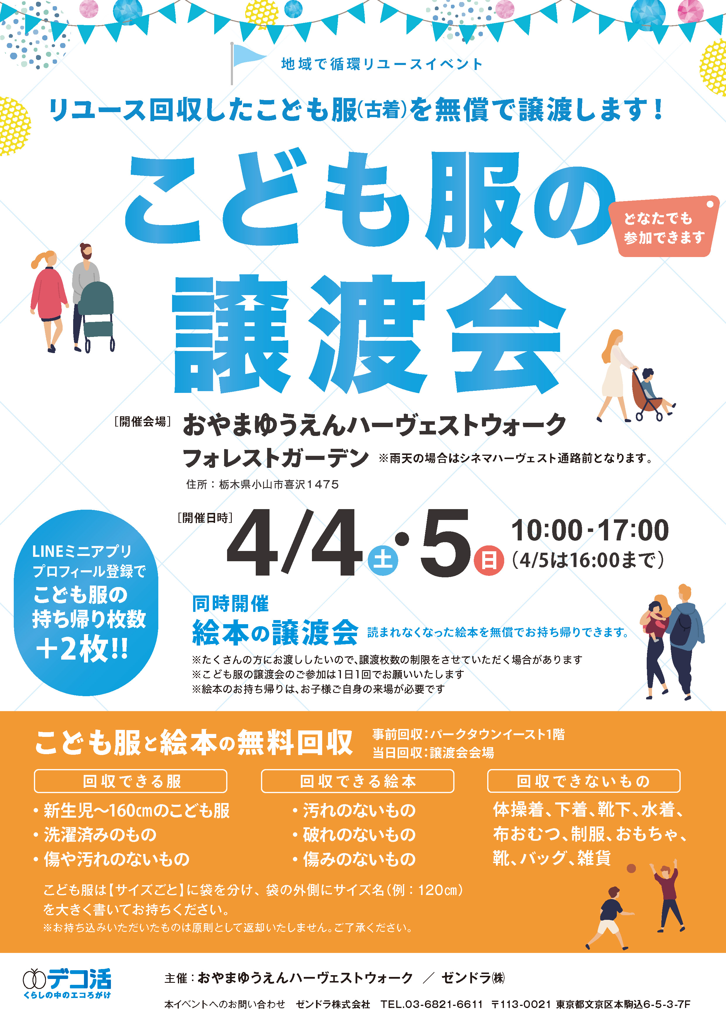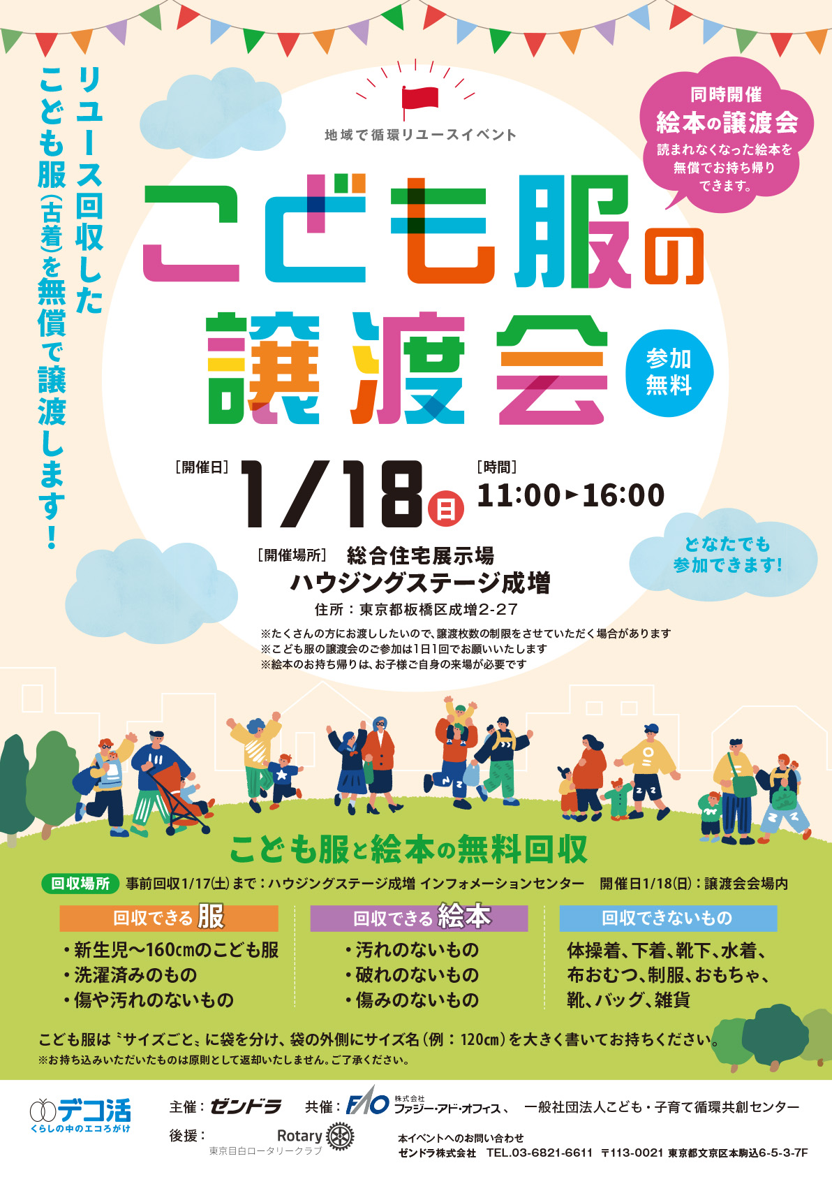 ゼンドラ株式会社では、善意で無料回収されたこども服を子育て中のご家庭(保護者)の皆様に橋渡しするイベント『こども服の無料譲渡会』を実施して おります。これにより、地域循環社会の構築とごみの減量によるゼロカーボン(脱炭素)を積極推進するとともに、子育て世帯への衣服を無償提供する事で、消費せずに浮いた金銭を他の消費に回していただくことへの間接的な生活支援を行っております。