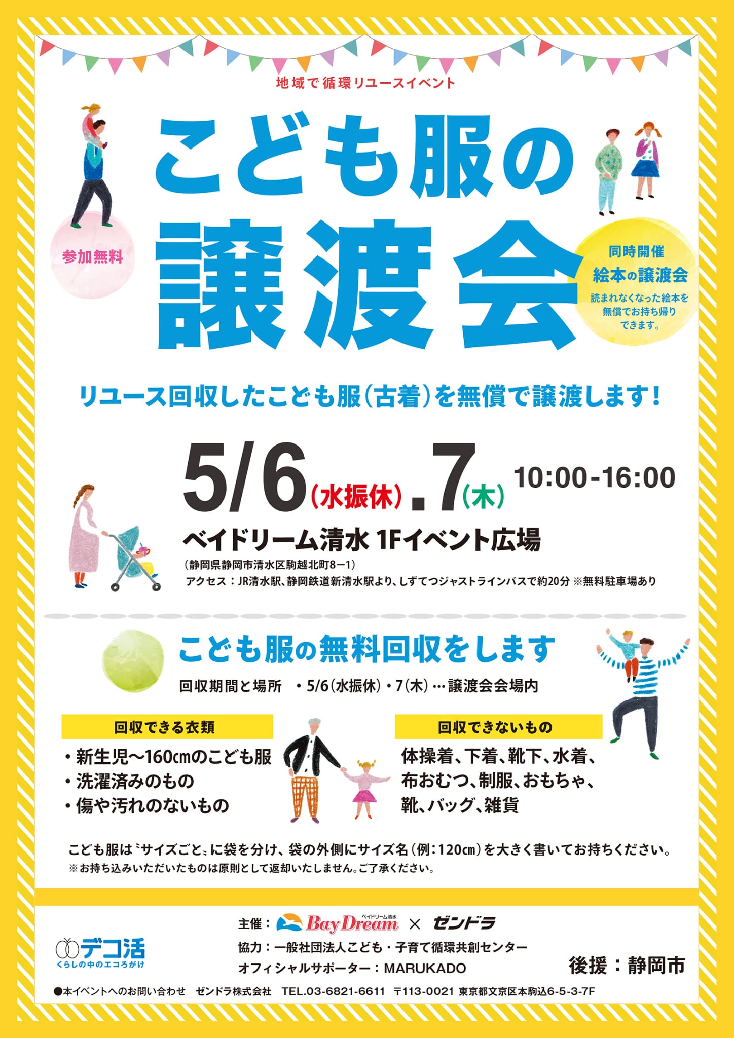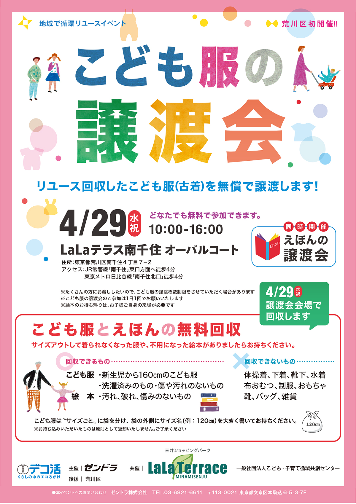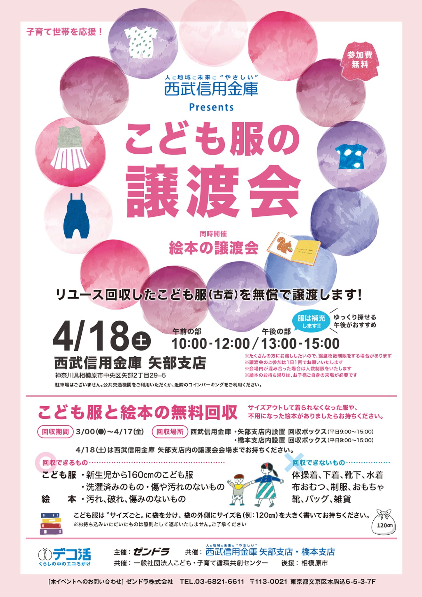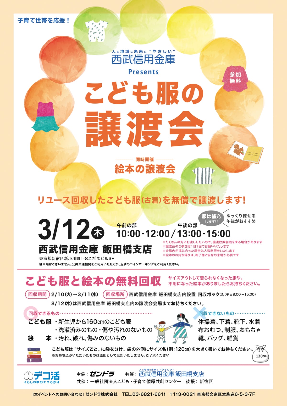 | ゼンドラ株式会社:マーケティング部 こども服の譲渡会 担当まで TEL:03-6821-6611 もしくは 問い合わせフォームからご連絡ください。 |