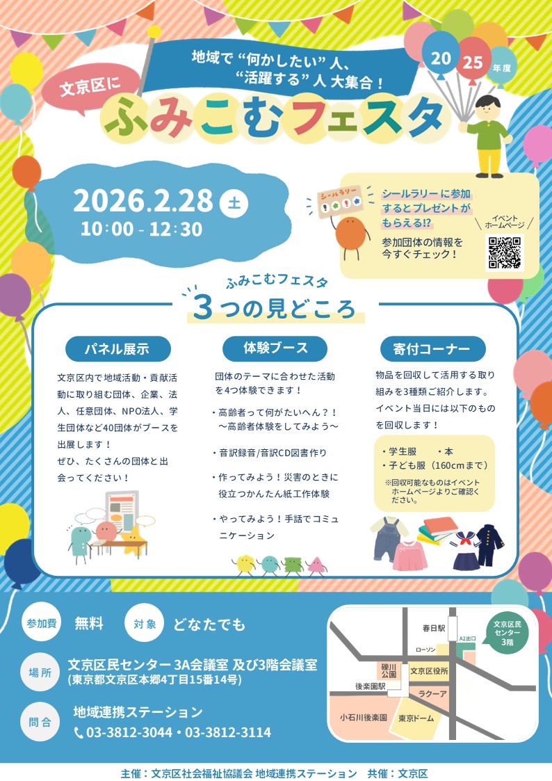 | (ご注意)こども服の回収のみ実施です 譲渡はございません 2月28日 東京都文京区 文京区にふみこむフェスタ2025 初開催 文京区民センター3A,3B,3D会議室・文京区本郷4-15-14 (施設詳細はこちら) ※一般社団法人こども・子育て循環共創センター にてブース出展いたします。 ![]() |