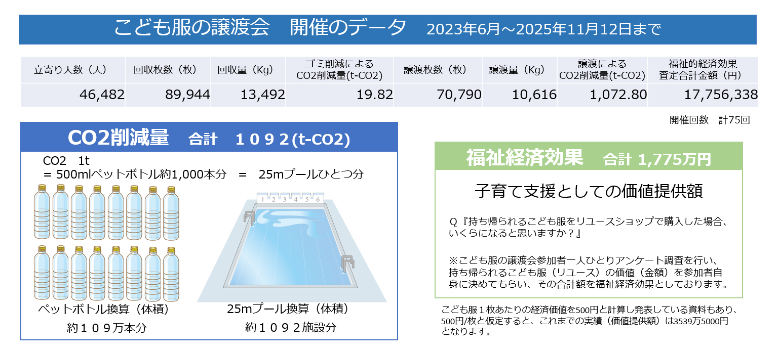 各地域・地方自治体において、デコ活(脱炭素につながる新しい豊かな暮らしを創る国民運動)推進の具体的な取り組みとして、また、住民の環境意識の向上や行動変容・サステナブルファッションの啓発・浸透につながるリユース推進の一つとして。そして、さらに子育て世帯への間接的支援(福祉経済効果の提供)を目指し、私たちが取り組む『こども服の譲渡会』を開催してみませんか?